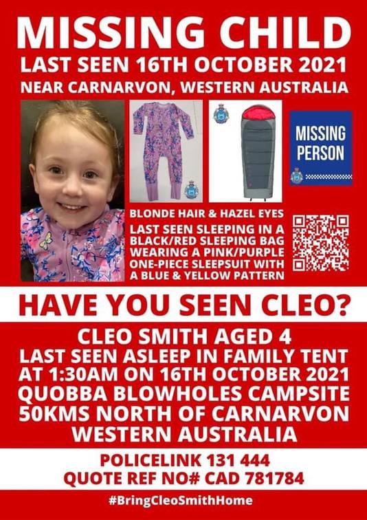 Cleo Smith 4 is missing in Western Australias remote north. The disappearance of missing four-year-old Cleo Smith has gripped WA for five days. The girl was wearing.